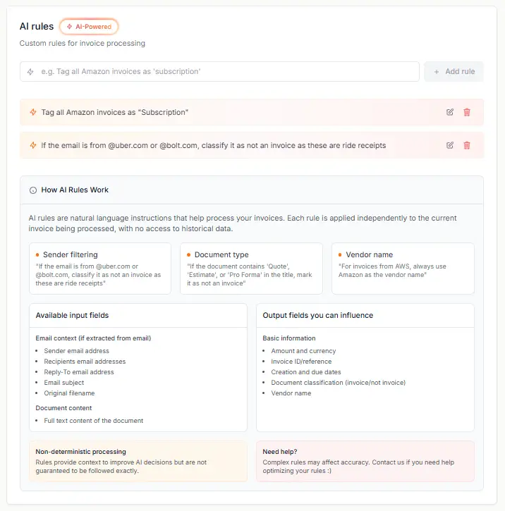 Rules are configured in plain language in under 5 minutes and apply automatically to every future invoice: