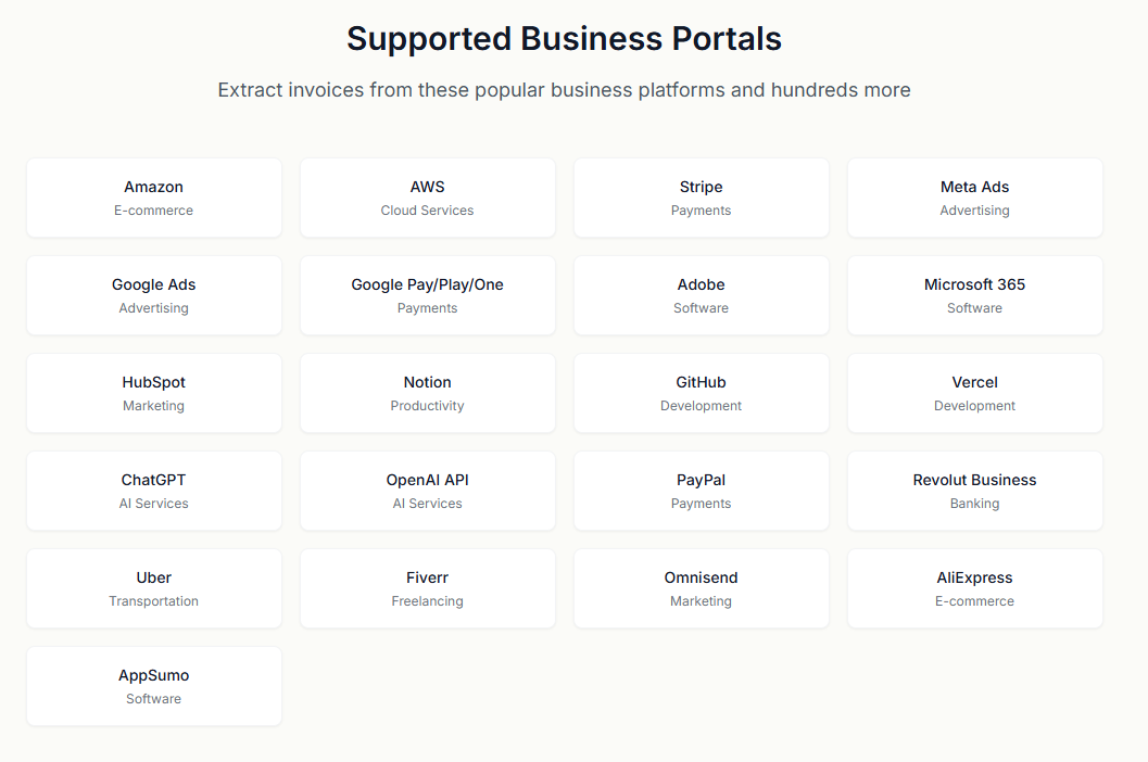 Tailride’s Chrome extension retrieves invoices directly from Amazon, Meta Ads, Shopify, Adobe, Notion, Microsoft, ChatGPT, and 20+ other portals using your existing browser session. You never enter a portal password into Tailride. One click per portal — all invoices in your dashboard. New portals are added regularly and can be requested via the feature board.
