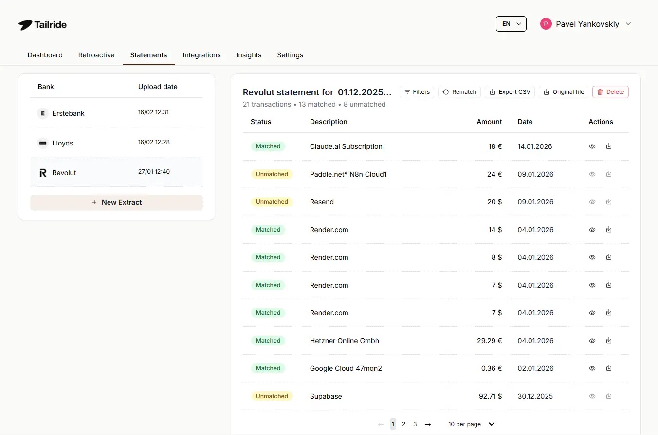 Upload bank statements in PDF, CSV, OFX/QFX, MT940/MT942, or BAI2 — the standard export formats from French and European banks. Tailride matches transactions against extracted invoices automatically with a 95% auto-match rate, flags any missing documents, and produces audit-ready reports. Multi-currency matching fully supported.