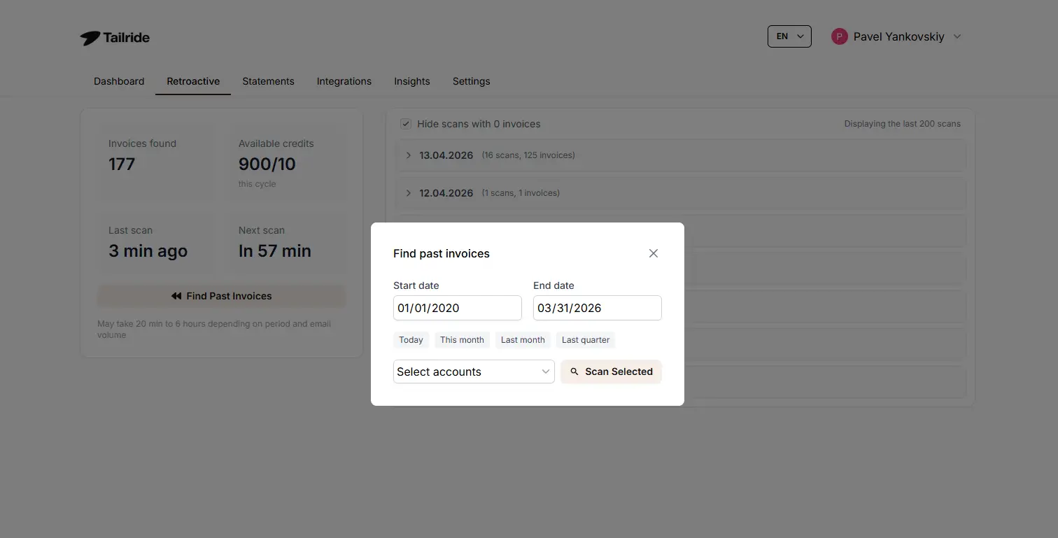 After connecting your inbox, go to the Retroactive tab and click “Find Past Invoices”. Choose your date range — this month, this quarter, this year, all time, or a custom window — and Tailride processes your full invoice history in one automated pass. There is no limit on how far back the scan can go.